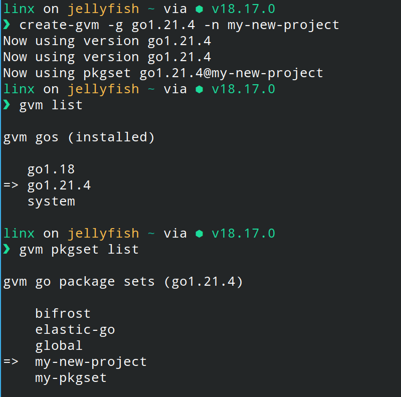 gvm use $goversion && gvm pkgset create $name && gvm use $goversion && gvm pkgset use $name